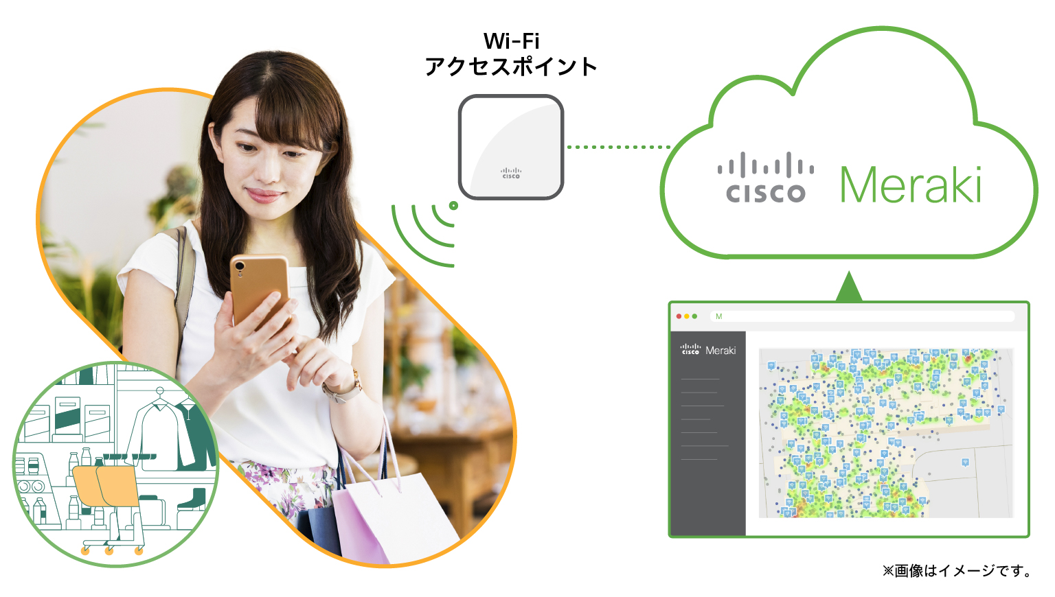 例えば、クラウド上の Meraki ダッシュボードを通じて複数のアクセスポイントを一元管理し、ネットワークの設定や変更、トラブルシューティングなどをそこから行えます。またロケーションヒートマップ機能ではアクセスポイントの利用状況を視覚的に把握でき、アクセスの集中が通信品質の低下の原因になっていれば、その場で設定を変更して対応することもできます。