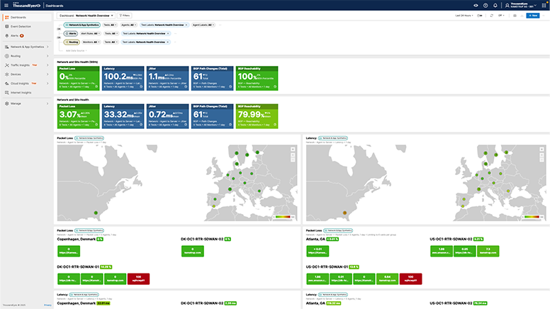 The Cisco ThousandEyes dashboard displays an overview of network health and performance.